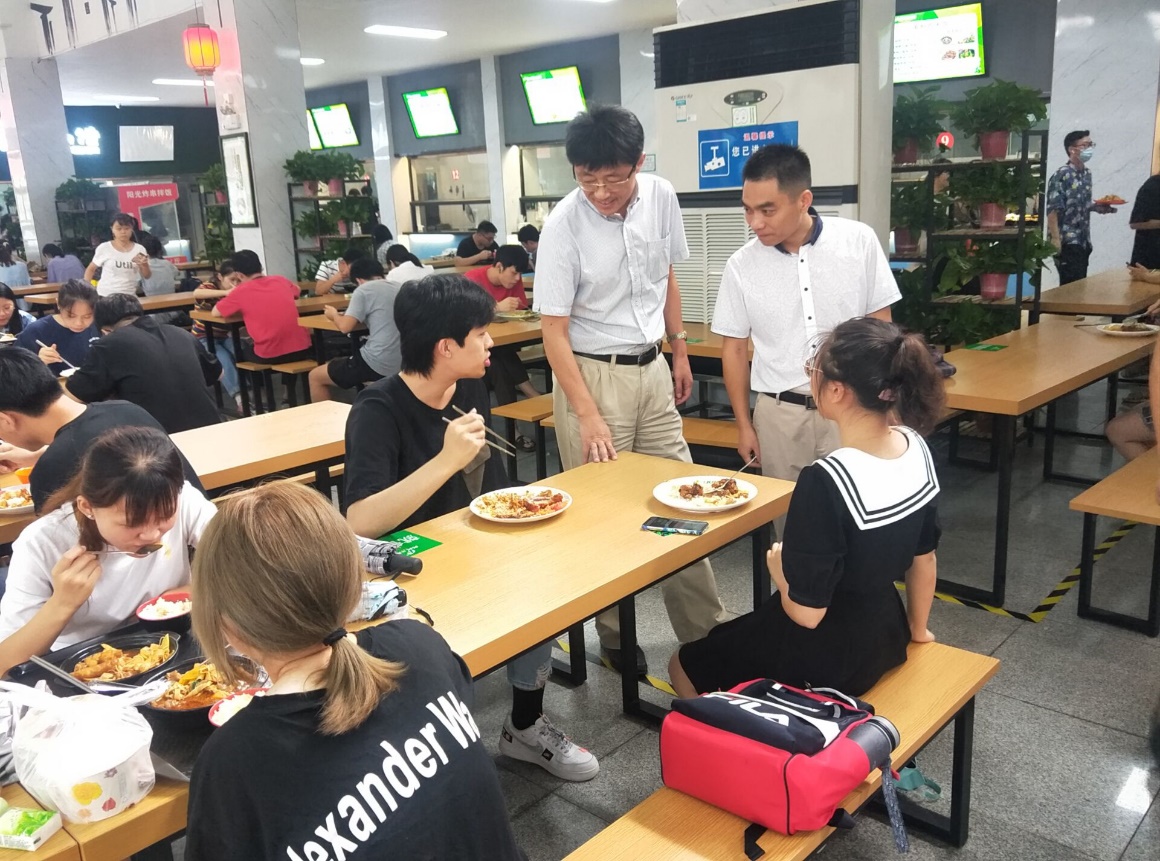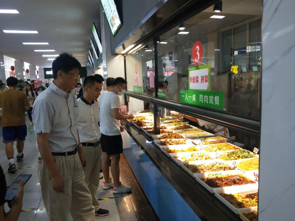 9月10日上午,校党委常委、副校长韩军一行,检查学生食堂保障情况,指导制止餐饮浪费行为,倡导“光盘行动”;要求食堂严格落实窗口挂牌售价,设立低价菜和自助匀饭窗口等;现场询问就餐学生伙食质量和饭菜价格情况;对发现的问题,要求餐厅立即整改,并对全面提升食堂窗口服务质量提出具体指导意见。