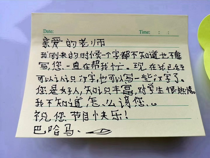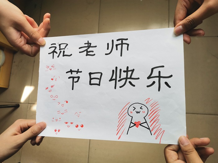 “亲爱的老师,您是好人,我不知道怎么谢您,祝您节日快乐!”国际教育学院留学生巴哈马用他稚嫩的汉字书写出了心中对老师最真诚的祝福。(通讯员:程玉磊)