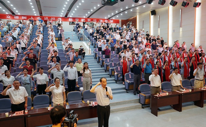 校长夏涛带领进行宣誓仪式,全体参会教师举起右拳、郑重宣誓。这既是对履行立德树人根本任务的承诺,也是争做“四有”好老师、为学校“双一流”建设奉献力量的决心体现。
