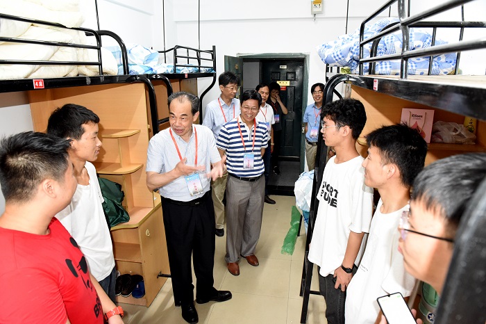 校领导仔细询问了解迎新组织工作和新生报到情况,实地查看了学生住宿环境与各项防疫举措,对各部门、学院的迎新工作给予充分肯定,并对参与迎新的师生表达亲切问候。