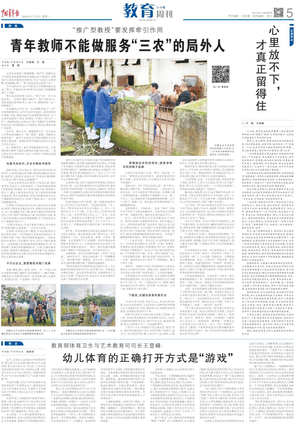 本网讯 今天出版的《中国青年报》第5版,用近一个整版的版面报道了我校“探索‘推广型’教授、鼓励青年师生到乡村振兴一线开展科技服务”的典型事迹。