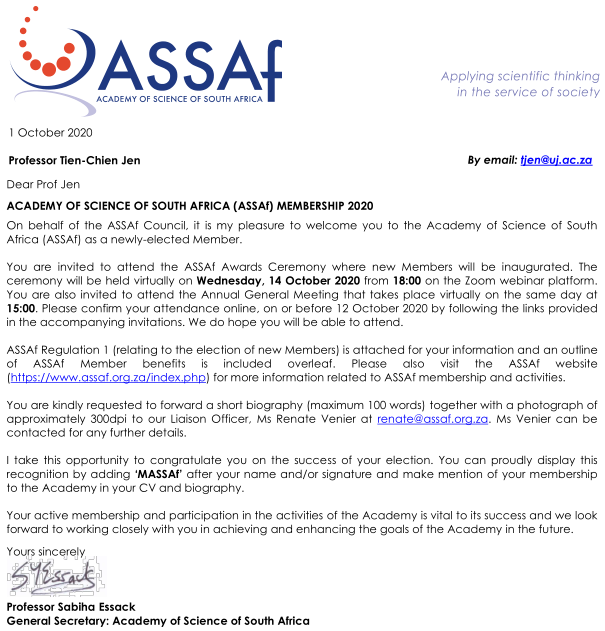 本网讯 2020年10月1日南非国家科学院(ASSAf)发函:祝贺我校讲席教授任天健当选南非国家科学院院士,以表彰他在传热、机械增材制造领域的突出贡献。