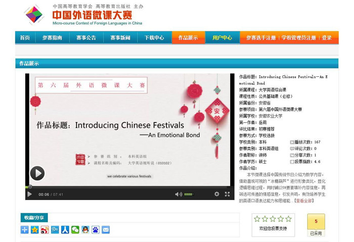 中国外语微课大赛由中国高等教育学会主办,高等教育出版社承办,教育部高等学校大学外语教学指导委员会协办,是在新形势下持续深化外语教学改革、探索外语教学新理念新模式的重要外语教学赛事。大赛于今年3月启动,至10月底结束,历经初赛、复赛、决赛三个阶段,全国各高校共有2590支团队参加,共有371支团队获得全国决赛奖项。