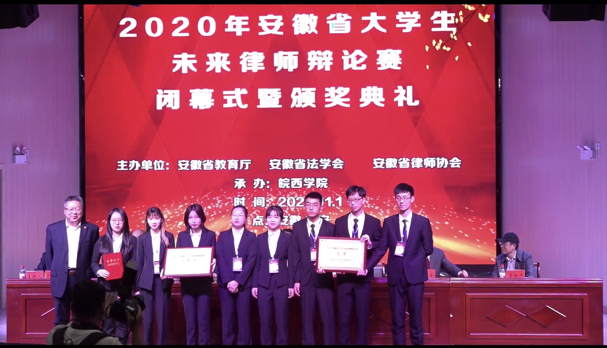 本网讯11月1日,由安徽省教育厅、安徽省法学会、安徽省律师协会主办的2020年安徽省大学生未来律师辩论赛在皖西学院落下帷幕。人文社会科学学院法学专业学子组成的代表队一路历经初赛、复赛、半决赛的层层选拔,从来自全省的二十多支队伍中脱颖而出,成功进入四强决赛,最终取得本次比赛的亚军、团体一等奖的成绩,2019法学王炜同学获得全程最佳辩手。