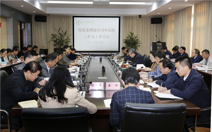 本网讯 11月3日下午,校党委中心组召开扩大学习会,集中学习党的十九届五中全会精神。校党委书记江春主持会议,校领导夏涛、裴树东、李红、马传喜、韩军、陈文兵、操海群出席会议。