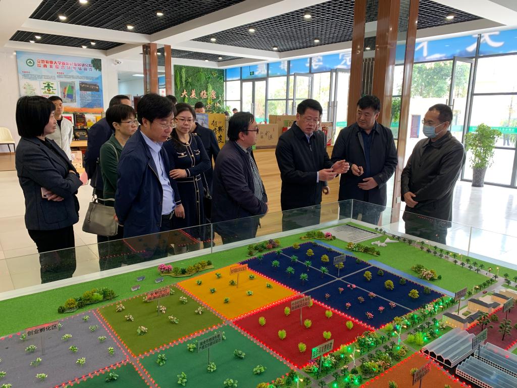 杨光荣一行首先来到试验站大楼展厅,观看试验站介绍展板和试验示范基地沙盘模型及秸秆昆虫转化利用试验,并听取相关工作汇报。杨光荣强调,试验站要认真学习贯彻党的十九届五中全会精神,继续发挥科技对农业产业化的支撑作用,加大技术、人才投入,加强科研攻关,探索孵化形式,强化示范引领、辐射带动,推动现代农业发展和乡村振兴。杨光荣希望临泉县及相关部门要积极创造条件,继续加大支持力度,为高校成果转化和技术推广提供政策环境保障,充分尊重市场规律,引导适度规模经营,不断促进农业增效、农民增收。同时也希望学校抢抓机遇,务实开拓,进一步加大体制机制创新力度,争取更多更大更高的项目落地,积极响应国家和省里的重大需求,把论文写在皖西北的大地上,为科技创新和区域经济社会发展作出新的更大贡献。