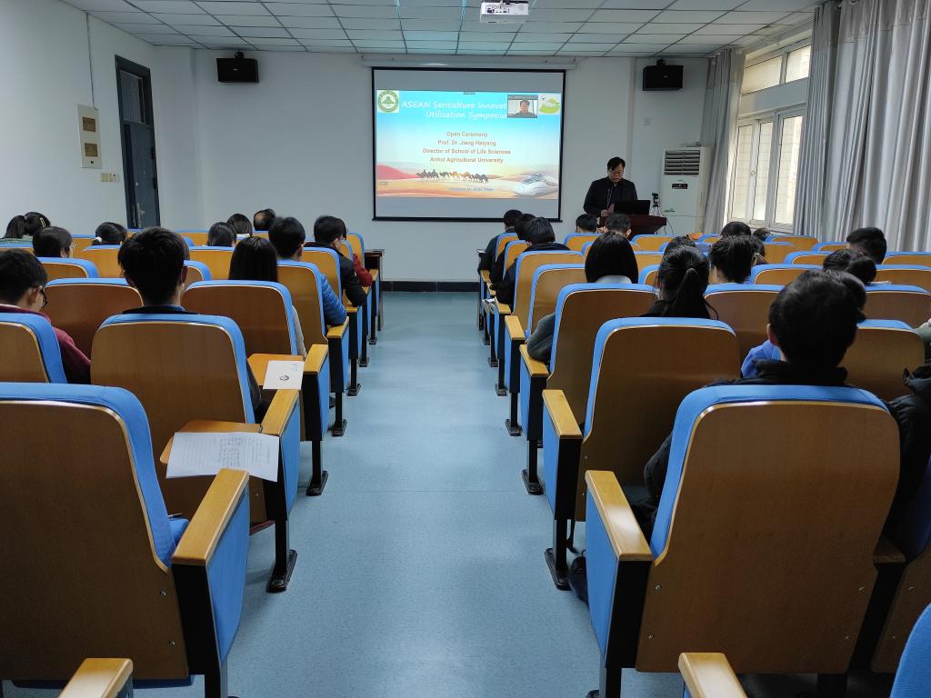 本网讯 11月24日,由我校生命科学学院主办的“中国-东盟蚕业资源创新与利用研讨会”在合肥召开。基于当前新冠肺炎疫情防控形势,研讨会采取线上线下相结合的方式,会议主会场设在生命科学学院,分别在泰国农业与国际合作部皇后丝丽绮蚕业司和清迈大学设两个分会场,来自中国、泰国、日本、老挝等国的蚕业科技工作者线上线下合计90余人参加了研讨会。生命科学学院院长江海洋教授出席会议并致开幕式辞,介绍了学校及生命科学学院发展历史、学科平台以及国际合作情况,希望以此会议为契机,进一步加强与东盟国家友好合作,并代表学校欢迎各国蚕业工作者前来学习和交流,指出蚕业技术的创新发展在“一带一路”的重大政策背景下对东盟国家互惠互利的重要国际影响。