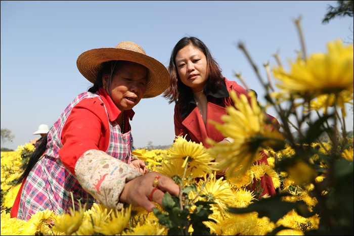 如今,金丝皇菊已经成为当地特色经济作物,还带热了乡村旅游,一到周末,一群群游客在漫山遍野的金黄金黄的金丝皇菊丛里拍照,帮助村民采摘菊花,和农户们分享着丰收的喜悦。