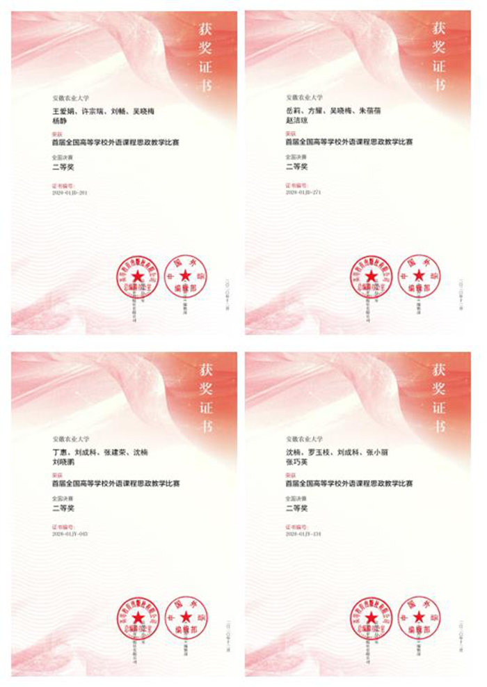 本网讯 近日,2020年首届全国高等学校外语课程思政教学比赛圆满落幕。我校外国语学院大学英语教学部王爱娟团队、岳莉团队荣获本科大学英语组全国决赛二等奖,英语系丁惠团队、沈楠团队荣获本科英语类专业组全国决赛二等奖,充分展示了我校外语教师优秀的教学水平和将课程思政融入外语教学的能力。