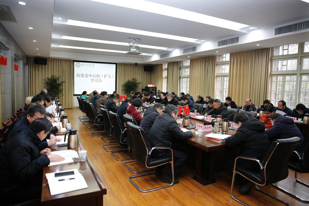 本网讯1月6日,校党委中心组(扩大)学习会议开展集中学习研讨,校党委书记江春主持会议。校领导裴树东、李红、马传喜、韩军、陈文兵、操海群出席会议。校党委中心组成员,机关各部门、校直各单位主要负责人,各学院党政主要负责人参加会议。