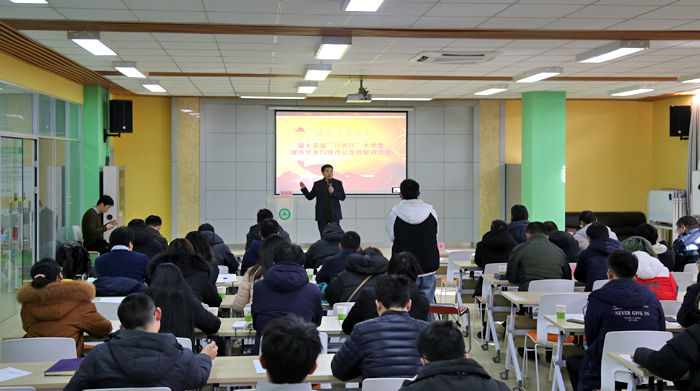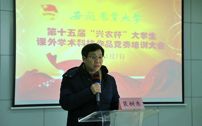 本网讯1月7日下午,我校第十五届“兴农杯”大学生课外学术科技作品竞赛培训会在大学生创客空间A区路演大厅举行。校党委副书记裴树东出席会议。电科恒钛执行董事、安徽省创新创业竞赛领域资深专家夏振华,林学与园林学院教授陈玉霞分别为大家做了培训。教务处、校团委负责同志,各学院党委副书记、团委负责老师以及部分学生代表参加了培训会,线下和线上共2000余人参加了培训会。