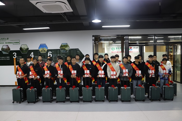 会后,武装部为入伍大学生们发放了《苦难辉煌》、《安徽农业大学2020年服兵役退役士兵先进事迹汇编》和行李箱等纪念品,并与他们合影留念。(通讯员:程玉磊)