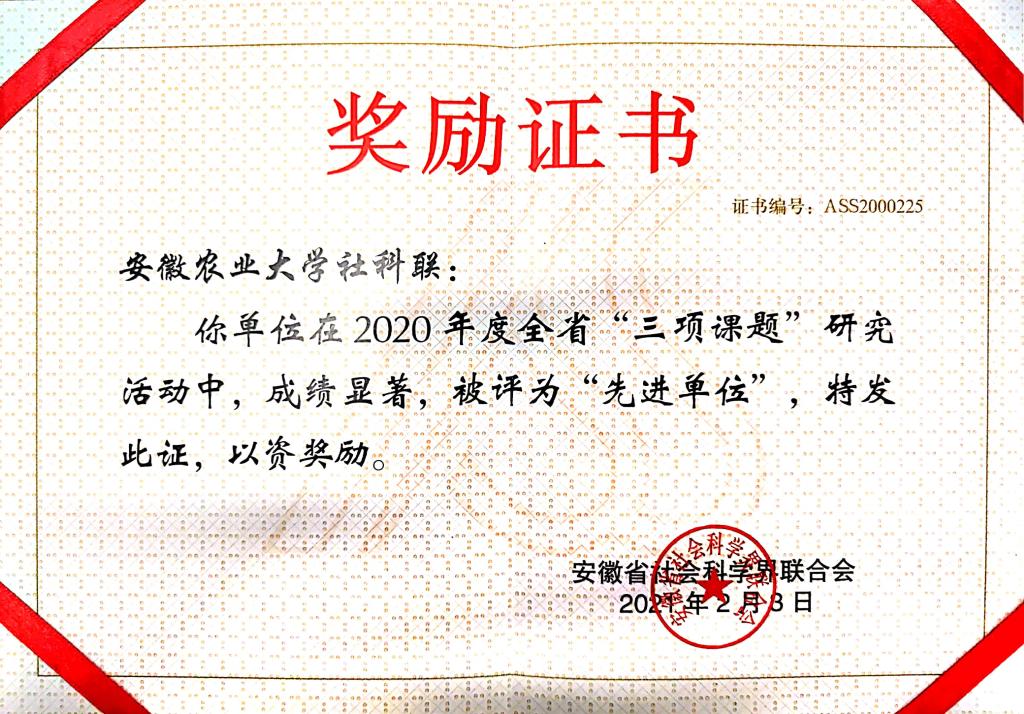 省社科联“三项课题”研究活动是紧紧围绕党的十九大及历次全会和省委、省政府重大决策部署,把决胜全面小康、决战脱贫攻坚等重大理论和现实问题作为主攻方向,开展基础理论研究、应用对策研究、社科普及研究的三项课题研究活动,为加快建设现代化五大发展美好安徽提供理论支撑和智力支持。我校社科联每年坚持开展“三项课题”研究活动,充分发挥智库作用,积极整合资源,强化思想引领,深化资政育人,推动理论惠民,努力推出高质量、有影响的优秀成果,已连续3年获省社科联2020年“三项课题”研究活动先进单位。(科技处)