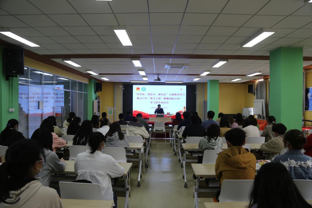 本网讯4月16日中午,我校“学党史、强信念、跟党走”主题教育学习暨2021年“青马工程--菁穗领航计划”学习班开班仪式在大学生创客空间路演大厅举行。校党委副书记裴树东出席会议并作专题报告。校团委负责人、全体工作人员、相关学院团委负责人、本期“青马工程”学习班全体学员参加了会议。