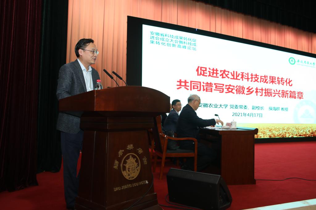 操海群在高峰论坛上作《促进农业科技成果转化 共同谱写安徽乡村振兴新篇章》主题演讲。演讲围绕农业科技成果转化的新机遇、安徽农业大学科技成果转化工作、农业科技成果转化的问题和思考等方面,研判了农业科技成果转化面临的新形势、新需求,介绍了我校开展校县合作、校企合作、培育大成果、强化机构建设等相关工作成效与做法,分析了当前农业科技成果转化中存在的不平衡不充分问题,提出了促进农业科技成果转化应对措施与思考。