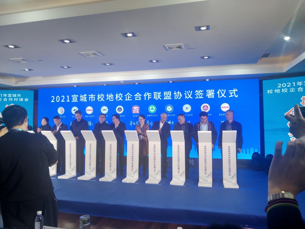 李红在会议期间受到宣城市委常委、组织部长朱立军热烈欢迎,并就大学生就业、人才培养与特色试验站建设等校地合作进行了深入交流。会上李红代表学校与宣城市签署了“宣城校地合作联盟”协议。