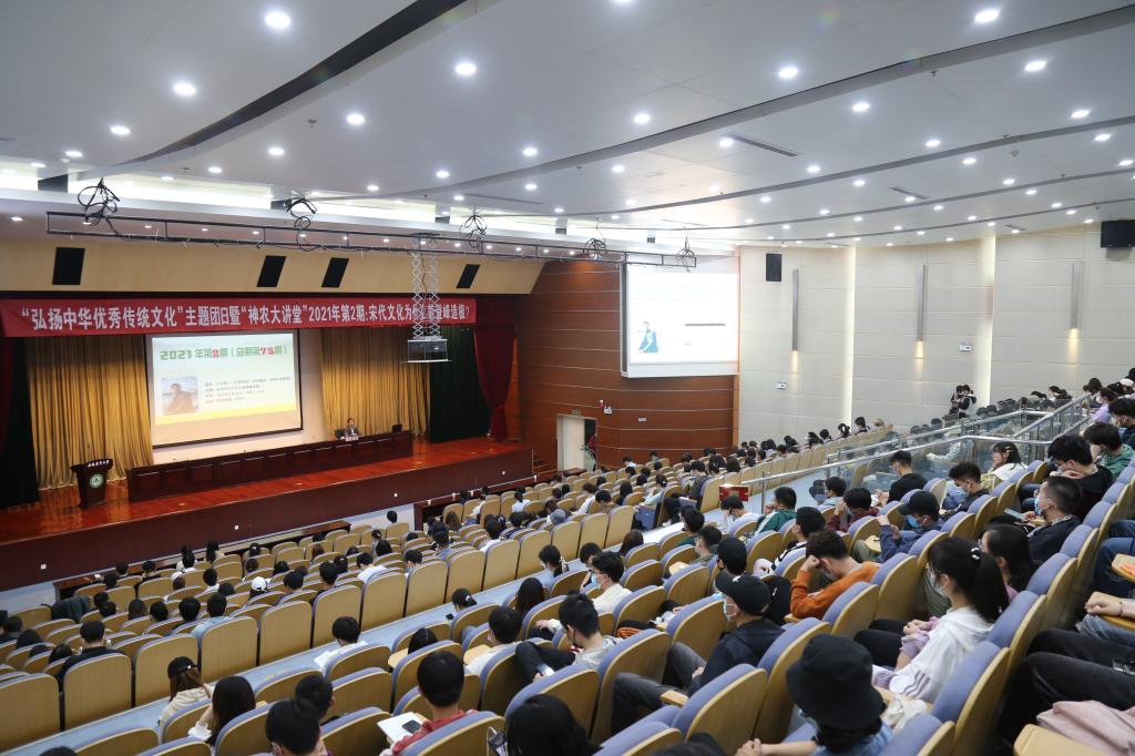 本网讯 4月23日晚,《百家讲坛》主讲嘉宾、深圳大学教授王立新做客我校2021年第2期“神农大讲堂”,在图书馆第一报告厅为我校师生带来了一场主题为“宋代文化为什么登峰造极?”的精彩讲座,全校300余名师生一同聆听了讲座。