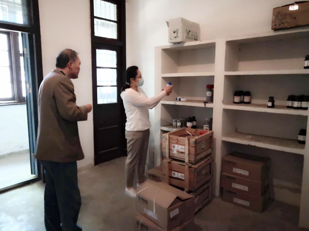 李红对学校耗材仓库库房安全、耗材分类存放、发放管理、药品试剂的存储量、存储日期等进行了详细问询和安全检查。对废弃物中转站的分类存储、装箱清单等进行了详细查看。