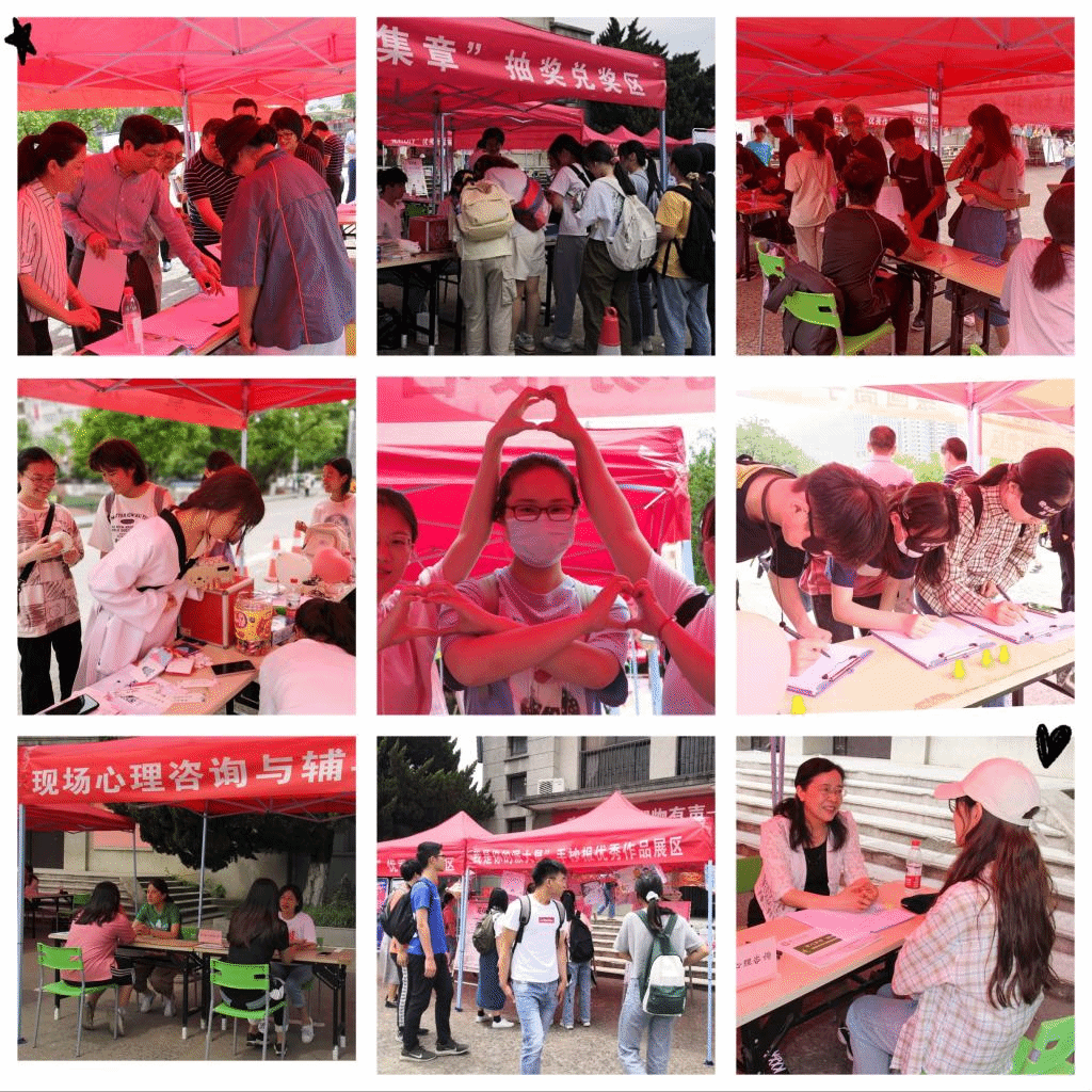 本次成果展主要展示“3.25善爱我”“5.25我爱我”心理健康主题实践活动系列成果,现场设置成果展示区、知识宣传区、活动体验区和心理咨询与辅导区等四个展区,包括DIY花灯制作、心理健康海报制作、原创心理漫画、纸艺布景、风筝涂鸦、调研报告等优秀作品展示。心理游戏活动体验区设有“我是歌手”“我型我秀”“蒙面高手”等体验互动,并集卡抽奖,吸引了众多同学驻足参与,现场气氛热烈。同学们纷纷表示,参与即有收获,团队协作,相互信赖,释放压力,增强自信,能量满满。本届心理健康主题实践活动历时三个月,以“3.25”“5.25”等重要教育节点为契机,激发学生主体意识,打造贴近学生需求的心理健康教育活动品牌。校院两级联动,开展系列活动,累计近1万人次参与。