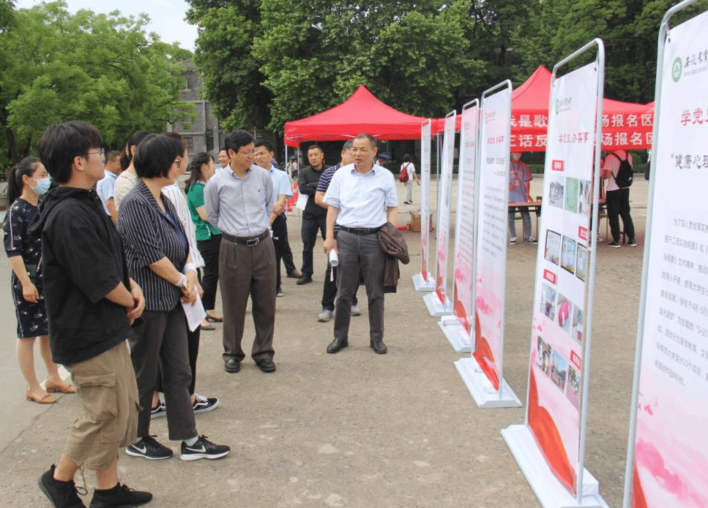 本网讯5月25日,我校在大礼堂前举办“育心育德 润物有声”2021年大学生心理健康教育成果展暨“5.25”全国大学生心理健康日主题活动。校党委副书记裴树东、各有关部门负责人及各学院分管学生工作负责人莅临现场参观指导。
