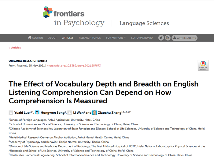 本网讯 5月25日,我校外国语学院开展的有关词汇深度和词汇广度对听力理解的影响机制的研究论文“The Effect of Vocabulary Depth and Vocabulary Breadth on English Listening Comprehension Can Depend on How Comprehension Is Measured”在SSCI收录的国际期刊Frontiers in Psychology (Language Sciences)上在线发表。