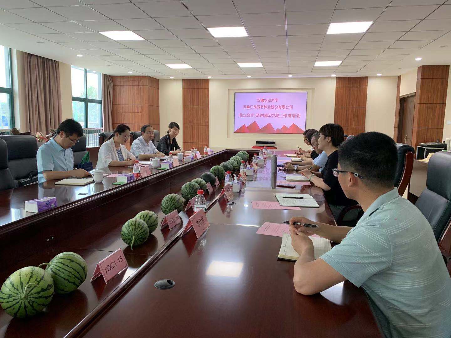 本网讯 6月2日下午,我校与安徽江淮园艺种业股份有限公司校企合作促进国际交流工作推进会在安徽江淮园艺种业股份有限公司吴山示范基地举行。校党委常委、副校长李红出席了推进会并看望了我校在该地实习的研究生。安徽江淮园艺种业股份有限公司董事长戴祖云、总经理王雯雯以及校新农院、国合处、科技处负责人参加了推进会。
