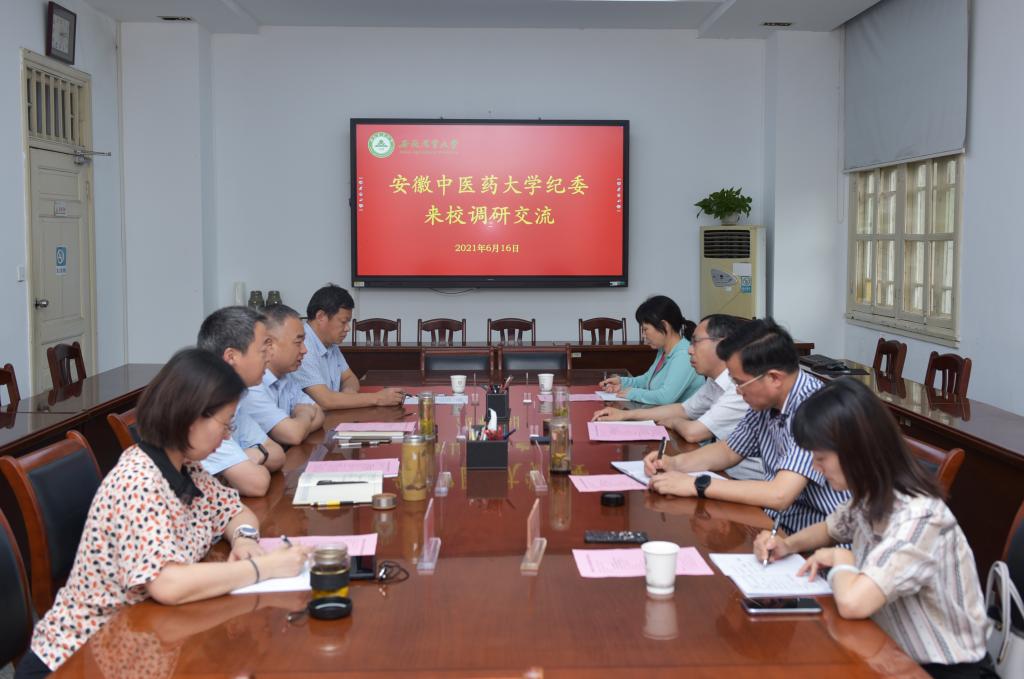 陈文兵对安徽中医药大学纪委来校调研表示欢迎,他介绍了学校发展历史、学校纪委基本情况及校内巡察情况。纪委副书记、巡察办主任彭庆刚就我校巡察工作作了全面介绍。