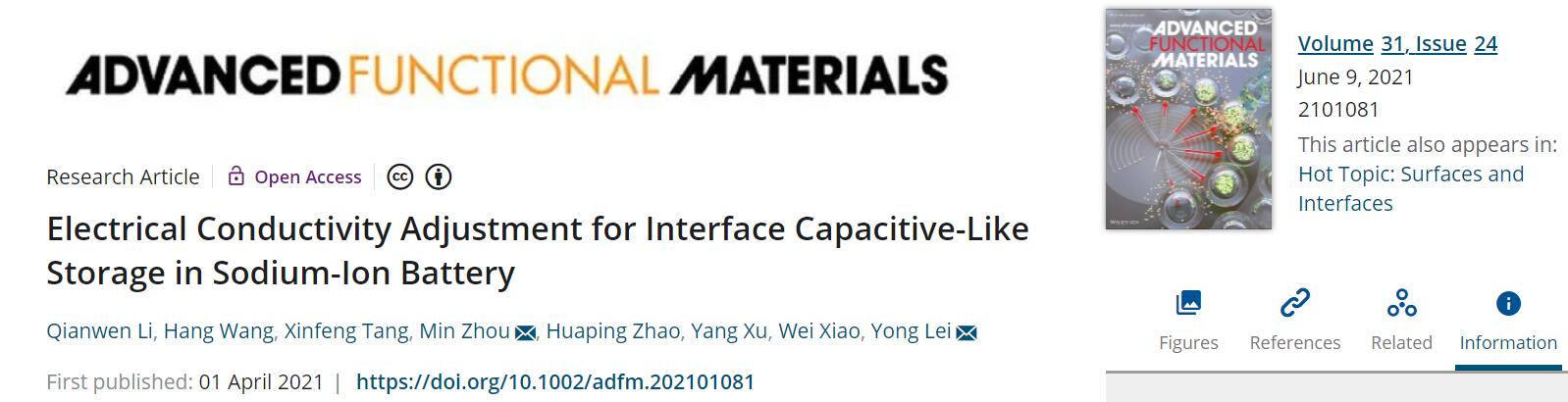 本网讯近日,我校轻纺工程与艺术学院教师李倩文以第一作者和我校为第一单位,在材料顶级期刊ADVANCED FUNCTIONAL MATERIALS(影响因子16.8)发表了题为“Electrical Conductivity Adjustment for Interface Capacitive‐Like Storage in Sodium‐Ion Battery”的高水平学术论文。