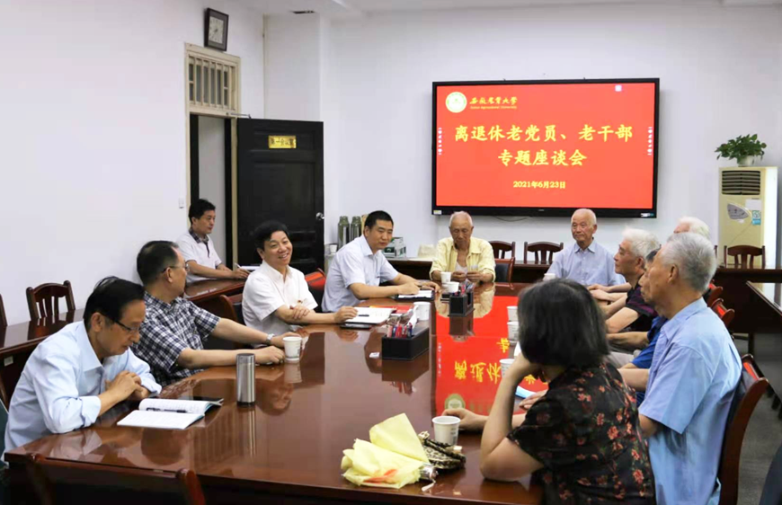 本网讯6月23日,按照校党委的工作部署,召开了离退休老党员、老干部学党史讲党史“我看建党百年新成就”专题座谈会。座谈会由校党委副书记裴树东同志主持,离退休老党员、老干部代表赵良庆、王华丽、蔡功舞、訾兴中、刘长安、胡德纯、谢超、冯德忠、朱世贤等参加了座谈会。
