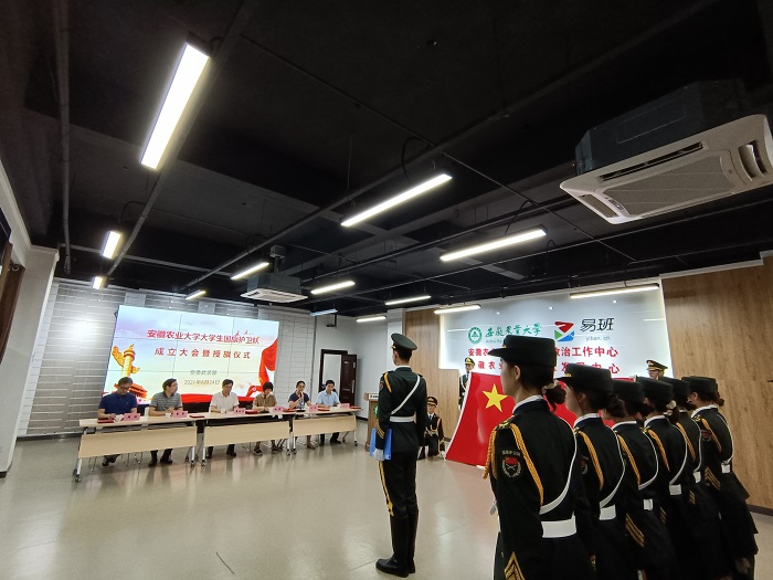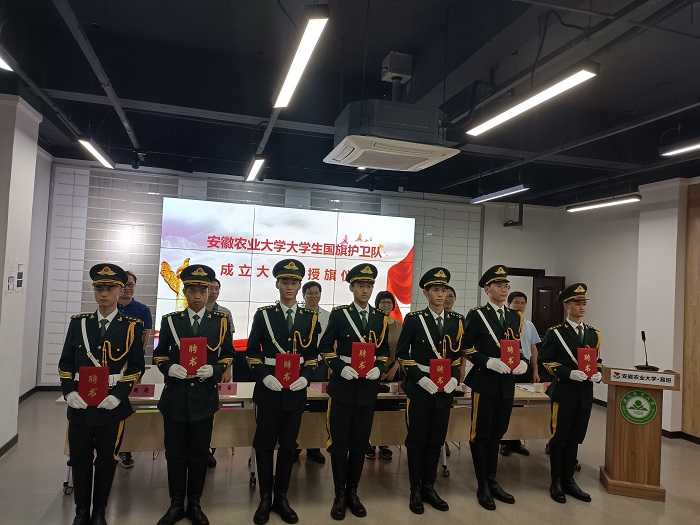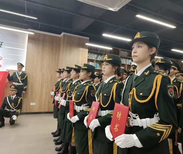 学工部(处)、武装部部长姚莉宣读了学校首届大学生国旗护卫队队员名单,与会领导共同为队员颁发了聘书。裴树东代表学校郑重地将鲜艳的五星红旗交到校国旗护卫队队长温家成手中,全体队员面向国旗,握拳宣誓,用响亮的声音喊出了“护我国旗,壮我国威”的豪迈誓言。