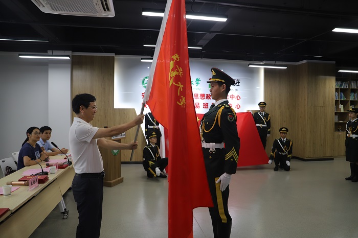 本网讯6月24日,我校首届大学生国旗护卫队成立暨授旗仪式在易班中心举行。校党委副书记裴树东出席仪式并讲话,党委宣传部、学工部(处)、武装部和团委等部门负责同志参加仪式。