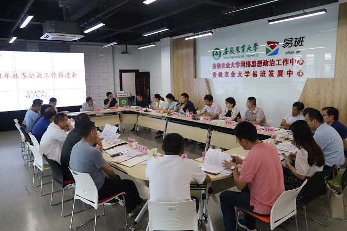 本网讯6月29日,校党委副书记裴树东在易班中心主持召开2021年秋季征兵工作推进会,对毕业生应征入伍工作再动员。校党委常委、副校长韩军出席大会,校党委学工部(处)、武装部,研工部、招生就业处、后勤保障处等单位负责人和各学院党委副书记参加推进会。