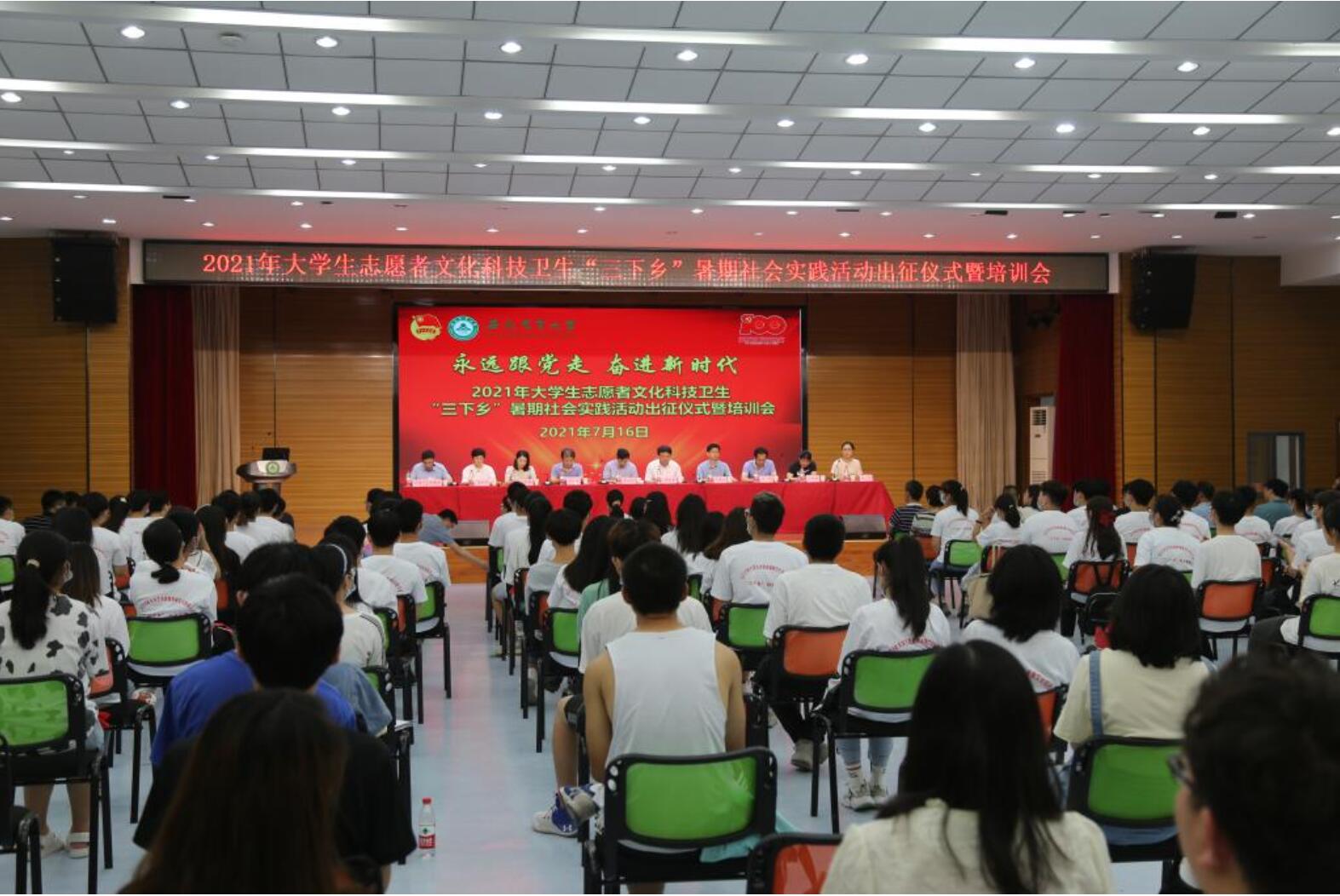 本网讯7月16日上午,我校2021年大学生志愿者暑期“三下乡”社会实践活动出征仪式暨培训会在大学生活动中心举行。校党委副书记裴树东,办公室、组织部、宣传部、教务处、新农村发展研究院、学生处、招就处、团委、马克思主义学院等单位负责人,各学院分管学生工作负责人、团委负责人,暑期“三下乡”社会实践校级重点、校级、院级团队成员参加了出征仪式。仪式由校团委书记林煦东主持。