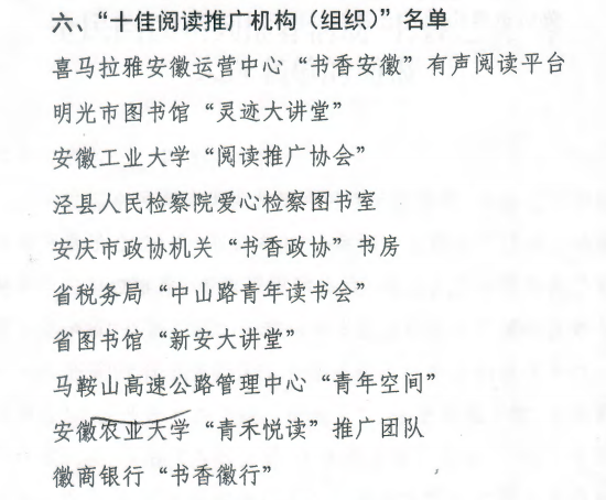 本网讯 为发挥典型引领示范作用,中共安徽省委宣传部组织开展了2020年“书香安徽”系列推荐活动。日前,中共安徽省委宣传部发出通报,安徽农业大学“青禾悦读”推广团队成功入选安徽省“十佳阅读推广机构(组织)”称号。这是我校继2020年获得安徽省“十佳阅读推广活动”以来再次获得“书香安徽”系列“十佳”殊荣。