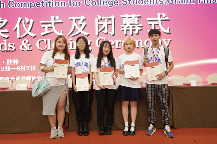 本网讯近日,2021年全国大学生英语竞赛全国总决赛在广西桂林圆满落幕。我校2018级英语汪莹、2019级法语张龙翔、2019级法语孙文、2019级植物生产类吴雪凡、2020级金融学马妍茹等同学,共获得辩论大赛二等奖1项,演讲大赛三等奖3项和优秀奖2项,风采大赛三等奖1项和优秀奖3项。这充分展示了我校学生扎实的英语语言基础和优秀的英语综合运用能力,也反映了我校外语教师在外语教学中坚持语言学习与技能培养并重的显著效果。
