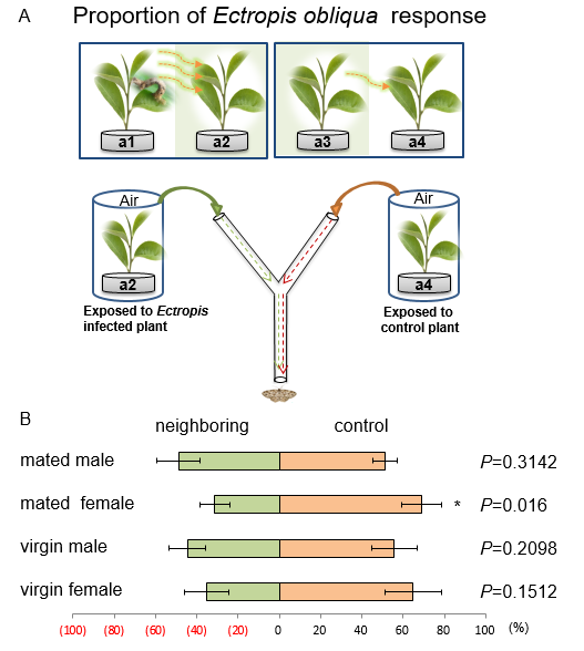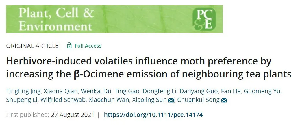 本网讯近期,我校茶树生物学与资源利用国家重点实验室宋传奎教授课题组和中国农业科学院茶叶研究所孙晓玲研究员课题组合作在国际知名期刊Plant, Cell & Environment(影响因子7.228)发表了题为“Herbivore-induced volatiles influence moth preference by increasing the β-Ocimene emission of neighbouring tea plants”的研究论文,该研究发现被茶尺蠖幼虫取食诱导的挥发物可激发邻近茶树β-罗勒烯的释放,进而提高邻近健康茶树对茶尺蠖成虫的驱避能力。这一研究将有助于深入认识植物挥发物的生态功能,拓展对挥发物介导的植物间信号交流机制的新认识。
