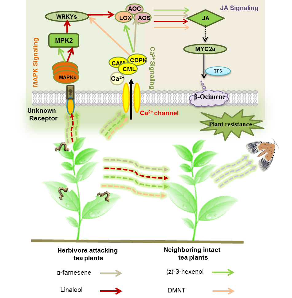在本研究中,课题组发现茶树在被茶尺蠖幼虫取食时,会释放多种挥发性物质,这些物质可提高邻近植株对茶尺蠖成虫(特别是交配后的雌虫)的驱避能力。通过进一步对临近健康茶树释放的挥发物的定性定量分析,结合茶尺蠖成虫行为分析,发现β-罗勒烯在其中发挥重要作用,结果表明:茶树在被茶尺蠖取食时释放的(顺)-3-己烯醇、芳樟醇、α-法尼烯和萜烯同系物DMNT可激发临近植株β-罗勒烯的释放。研究团队继续通过关键通路抑制实验,结合特定挥发物暴露实验,发现被幼虫取食释放的挥发物可通过Ca2+和JA信号通路激发临近健康茶树β-罗勒烯的释放。该研究揭示了挥发物介导的植物间信号交流新机制,对开发茶树害虫绿色防控及新型农作物虫害防治策略具有重要参考价值。