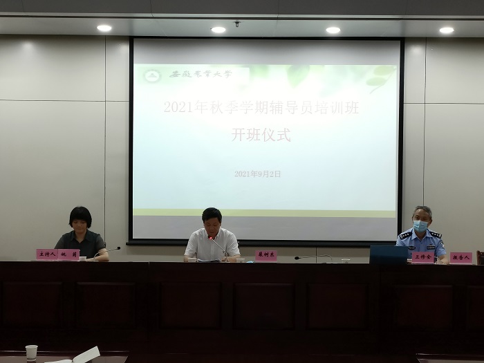 本网讯9月2日,学校2021年秋季学期辅导员培训班在图书馆第二学术报告厅举办。校党委副书记裴树东出席培训开班仪式并讲话。琥珀派出所所长卫修全,宣传部、教务处、学工部(处)、武装部、后勤保障处等部门负责人作专题报告。各学院党委副书记、全体专职辅导员、2021级新生辅导员参加培训。学工部(处)、武装部部长姚莉主持培训会。