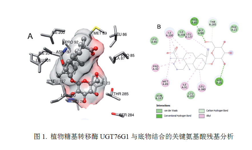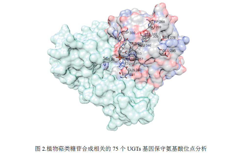 萜类化合物是天然物质中最多的一类物质,有些具有较强的香气和生理活性。在植物长期的进化过程中,逐步形成了一种可使自身不受到毒害的保护机制,其中糖基转移酶是这一复杂系统中重要的组成部分。植物香气物质糖苷化对植物体内挥发性物质的动态平衡、细胞内存储以及长距离运输等方面发挥着重要作用。该论文系统梳理了糖苷结合态萜类物质在植物体内的积累特点,总结了植物中控制单萜、倍半萜、二萜及三萜糖苷等合成相关的糖基转移酶UGTs的功能特征,发现GT1家族中存在至少13个亚家族与萜类糖苷合成相关;在此基础上,作者通过大量序列对比、结合已发表的UGTs晶体结构及分子模拟对接,分析阐述了与萜类物质(图1)、糖配体及产物特异性形成有关的氨基酸残基,讨论了参与萜类糖苷合成的UGTs蛋白的功能与结构之间的内在关系(图2),并就未来萜类物质糖苷合成机制方面的研究进行了展望。
