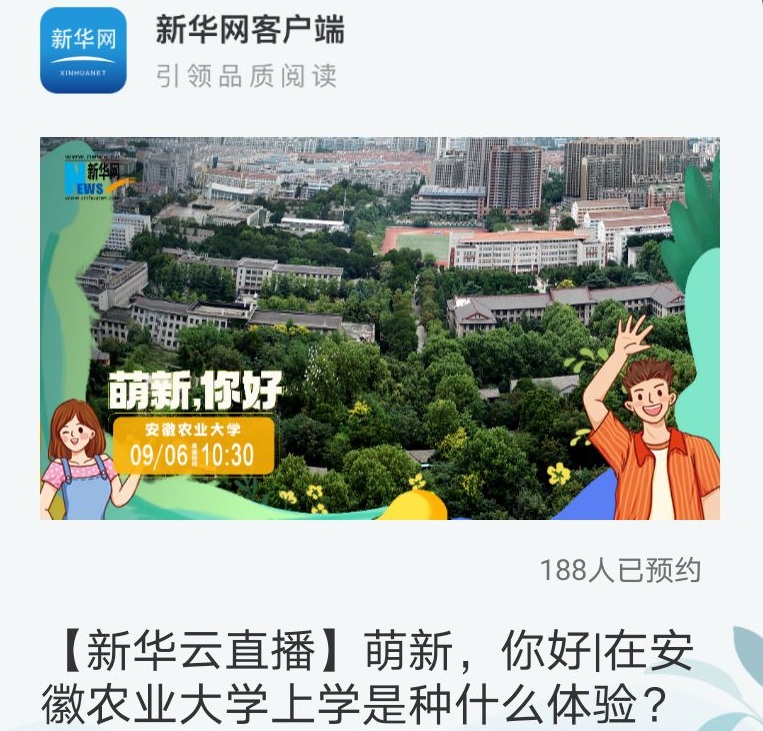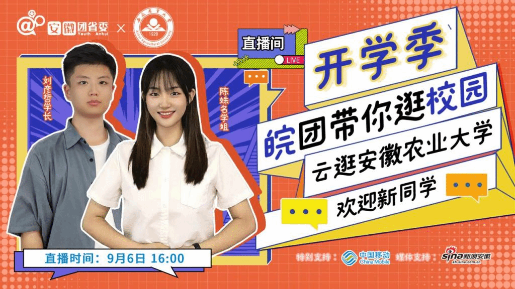本网讯 近日,新华网主办的“新华云直播—萌新,你好”和安徽团省委主办,中国移动、新浪安徽支持的“花young青春开学季-皖团带你逛校园”直播活动在我校开播,信息与计算机学院刘彦哲同学和轻纺工程与艺术学院陈姝名同学担任直播活动主持人。线上新老同学、学生家长、校友及热情网友等共80余万人“云游校园”。