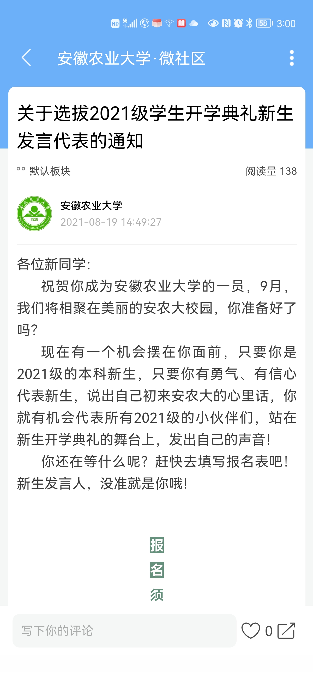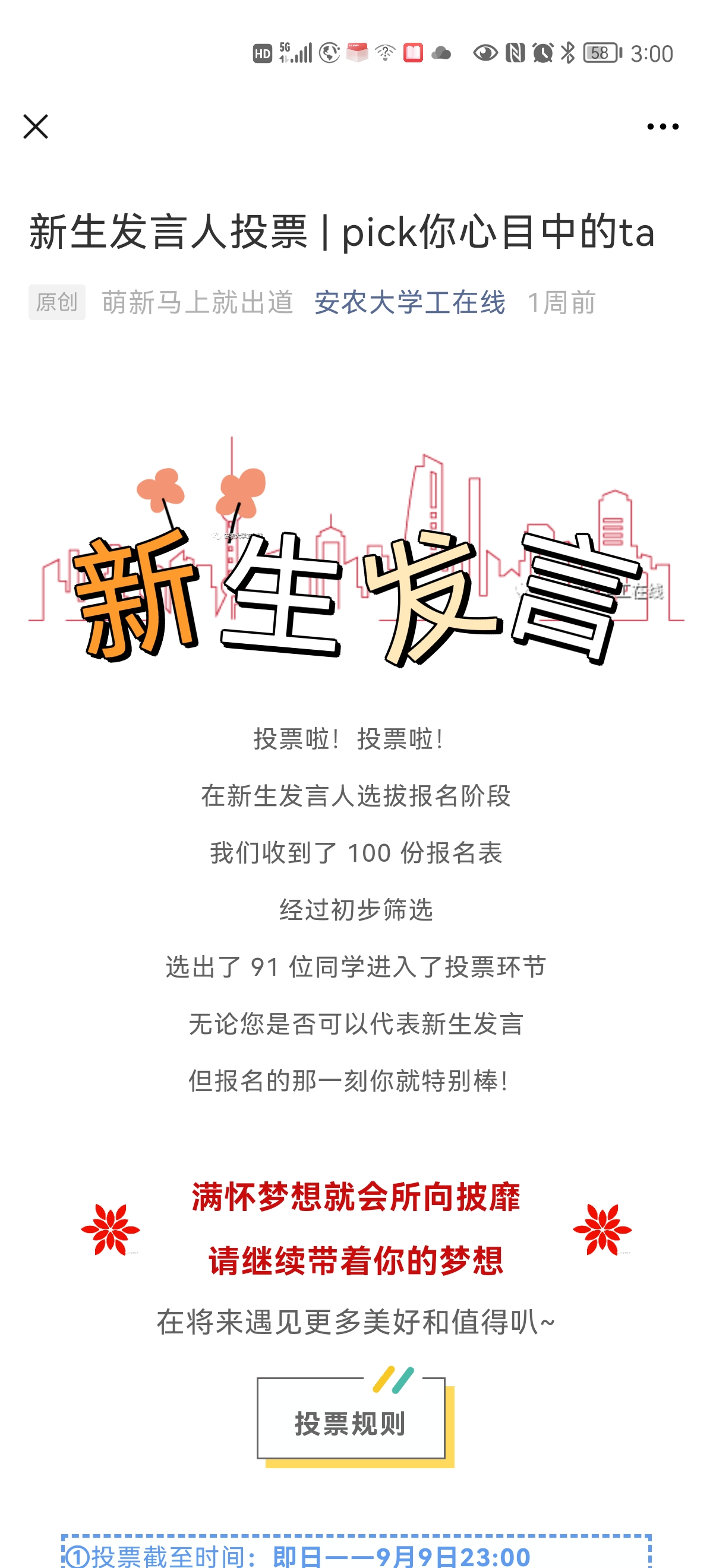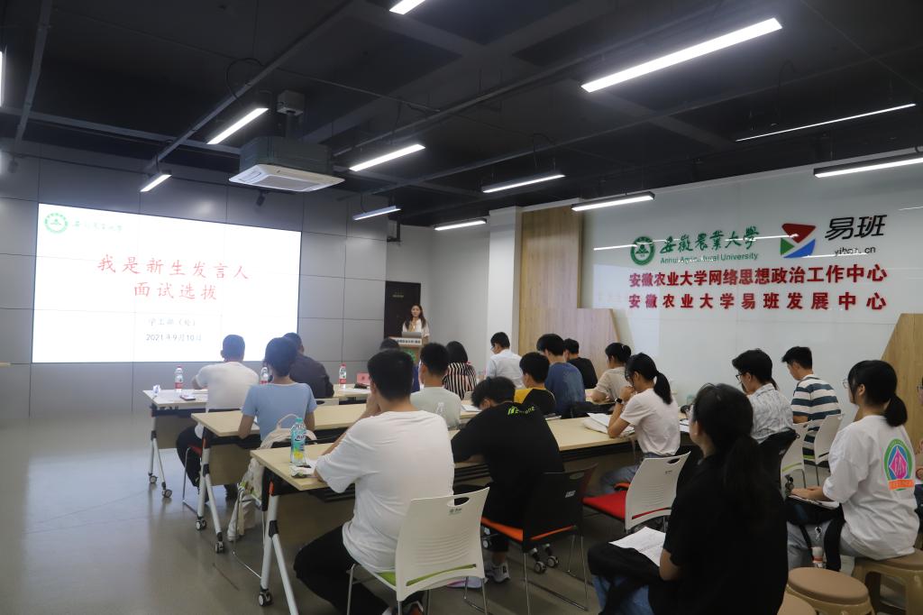 早在8月19日,我校易班发展中心就通过易班发布了《关于选拔2021级学生开学典礼新生发言代表的通知》,经过对100余份报名表的初步筛选、在安农大学工在线“pick你心目中的ta”的展示与投票、初面和终面,产生了此次开学典礼的新生代表。像选拔新生发言人一样,今年许多关于新生的工作早早就开始了。