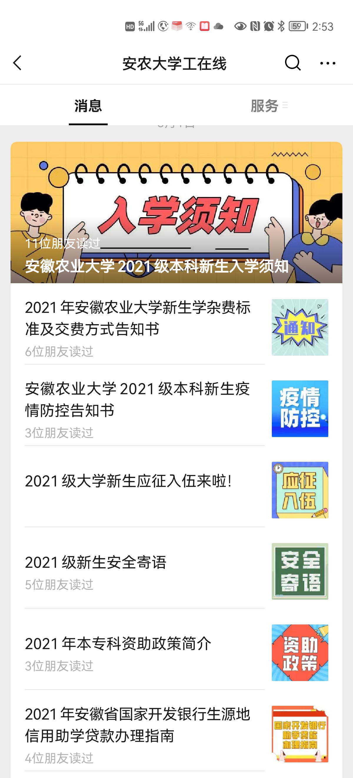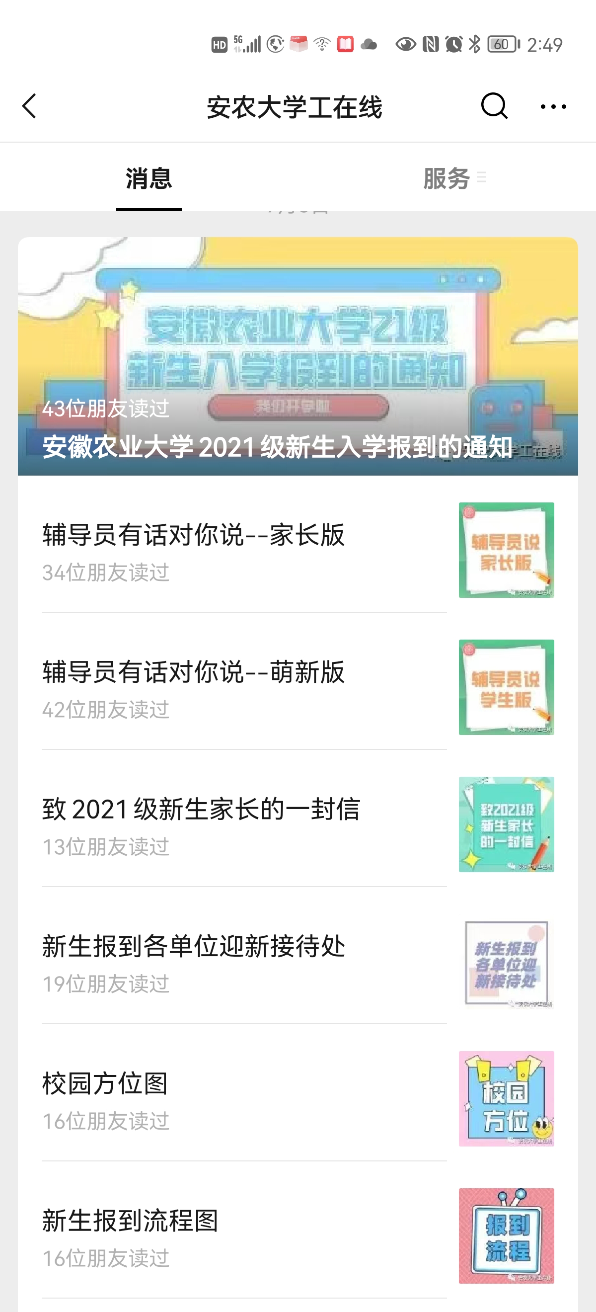 新生报到前,安农大学工在线发布《安徽农业大学2021级新生入学报到的通知》《辅导员有话对你说——家长版》《辅导员有话对你说——萌新版》《致2021级新生家长的一封信》等内容,所有与新生报到相关的流程、材料等都一览无余,使新生及其家长少一份担忧,多一份信任。