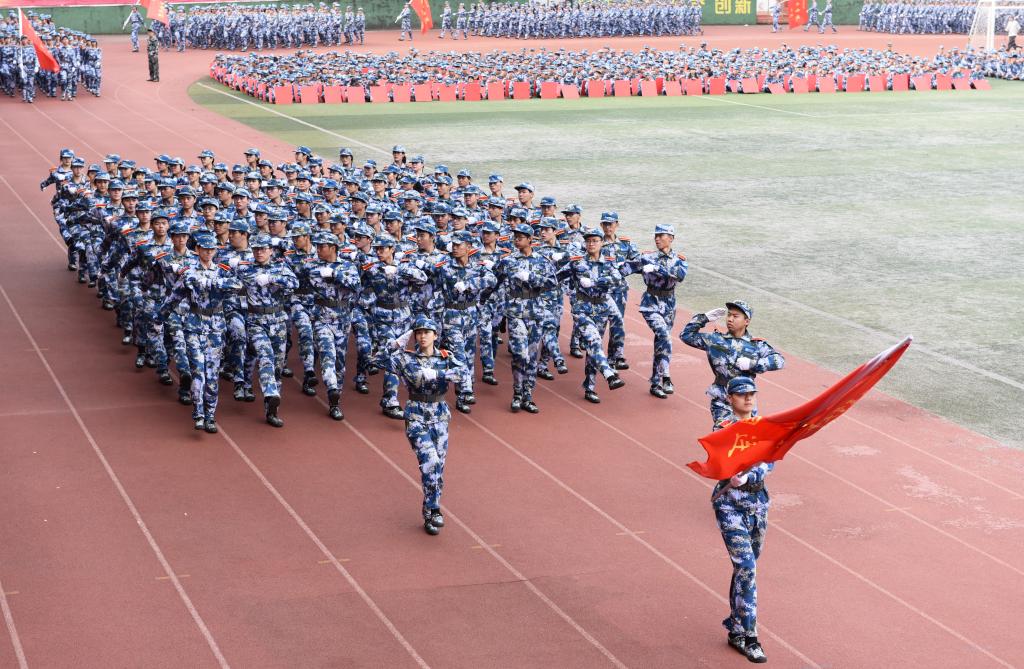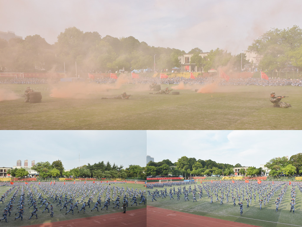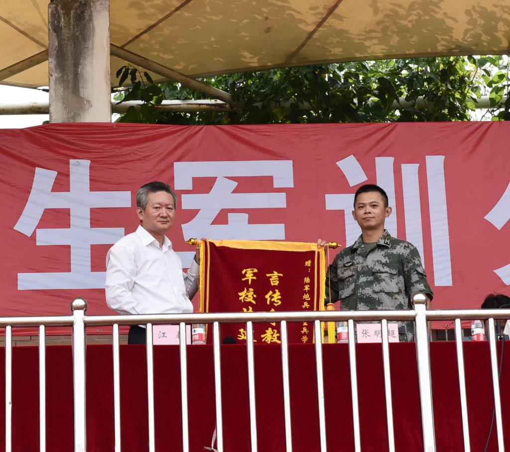 大会在庄严的国歌声中开幕。江春宣布学生军训分列式汇报表演正式开始,并向承训单位赠送了锦旗。