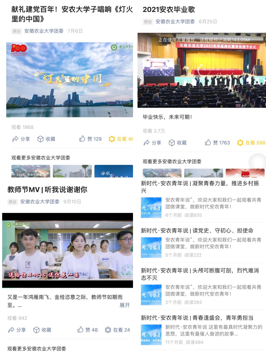 完善线上育人新阵地。着力建设校团委微博、微信、QQ空间、网站四位一体的网络布局,引领建设清朗和谐的校园网络环境。新媒体平台汇聚粉丝6万余人,发布《2021安农毕业歌》《灯火里的中国》主题MV,打造“新时代· 安农青年说”专栏,微信公众平台浏览量最高达2.5万次/条,推送思想引领为主的网路文化产品4751条,转发、点赞、阅读2000余万人次,单个话题最高阅读量达245万人次,校团委微信公众号获2017年“全国高校新媒体评选”最具人气奖;采用“活动+直播”的方式,将学校开展的各类思想引领活动传播给更广大的同学,有效提升活动的覆盖面和影响力,校团委线上育人模式也因此荣获安徽省教学成果三等奖1项。