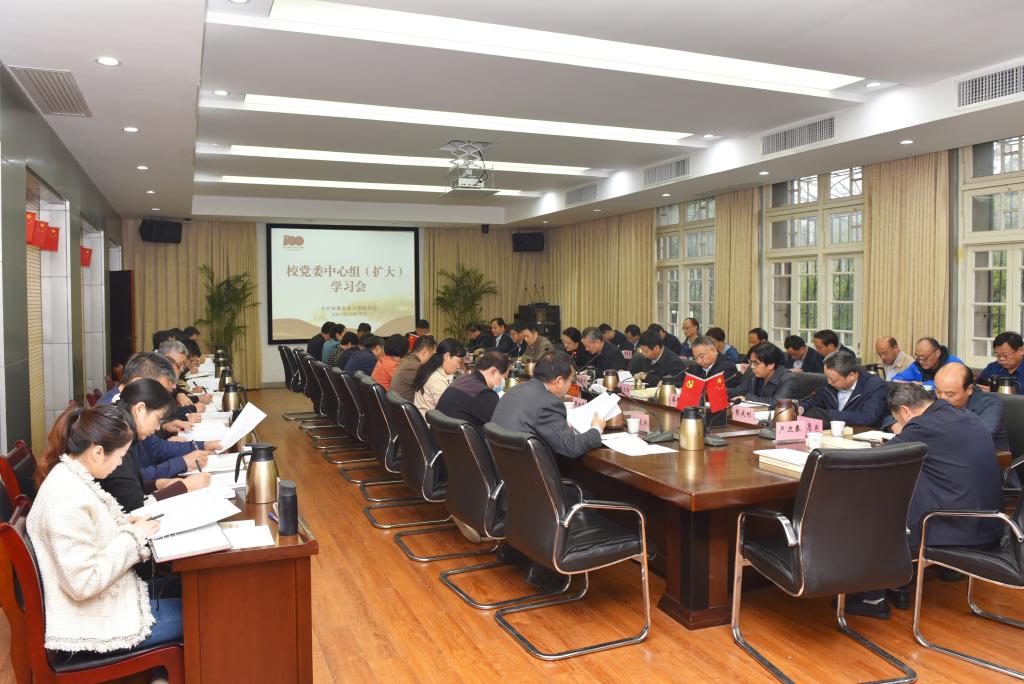 本网讯 10月15日上午,校党委中心组(扩大)学习会议开展集中学习研讨。校党委书记江春主持会议。校领导裴树东、李红、陈文兵出席会议。校党委中心组成员,机关各部门、校直各单位主要负责人,各学院党政主要负责人参加会议。