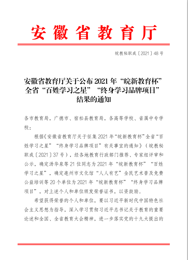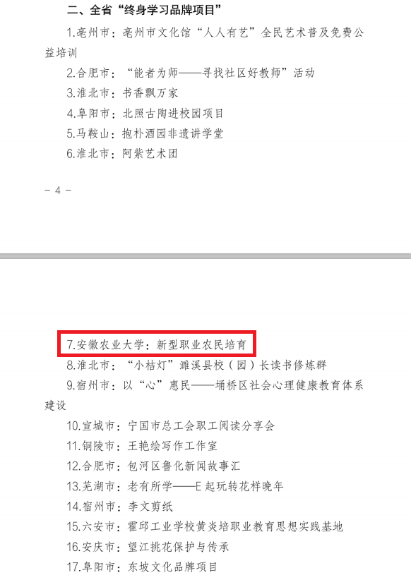 本网讯 近日,安徽省教育厅下发通知,公布了2021年“皖新教育杯”全省“百姓学习之星”“终身学习品牌项目”名单,我校继续教育学院申报的“新型职业农民培育”项目获评2021年全省“终身学习品牌项目”,这也是我校继续教育工作连续两年获得此项殊荣,充分体现了省教育厅对我校继续教育的肯定和褒奖。