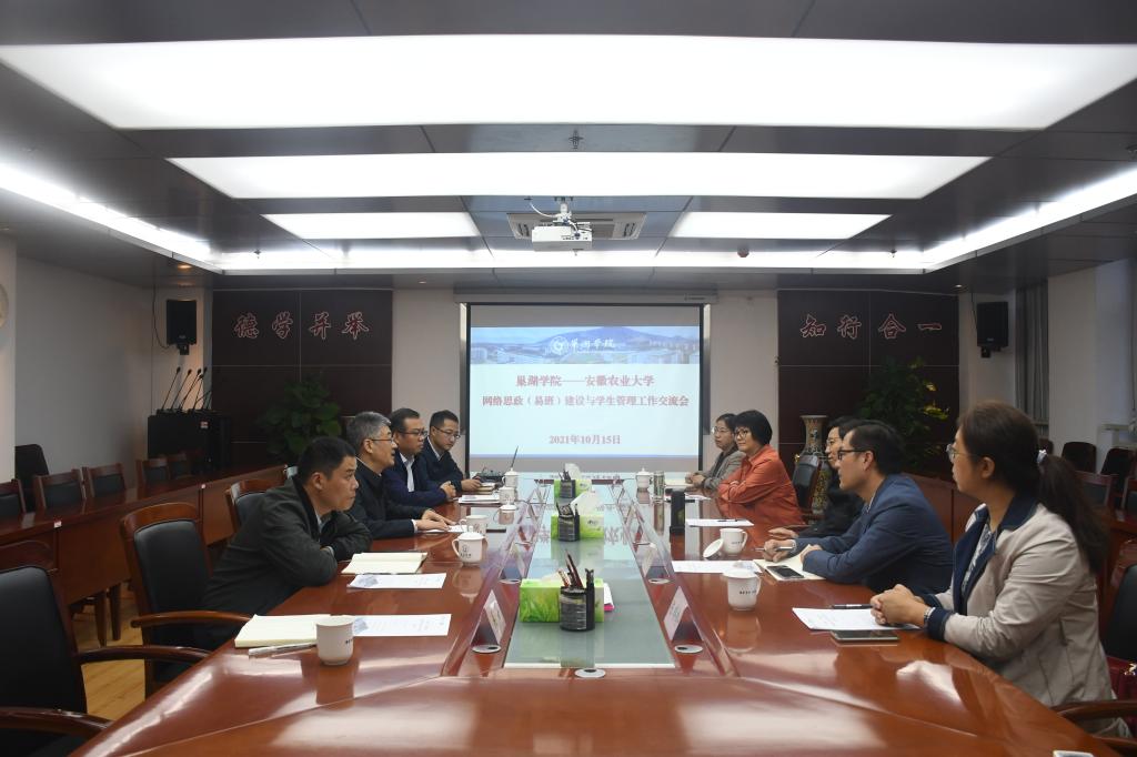 家访工作结束后,裴树东一行前往巢湖学院开展网络思政(易班建设)与学生管理工作调研。巢湖学院党委副书记阮爱民亲切接待了调研组,巢湖学院学工部部长周祥介绍了该校易班发展中心建设的总体思路和建设目标,学工部副部长华紫武介绍了该校易班发展中心的具体措施和特色活动。双方围绕网络思政、易班发展中心建设、辅导员队伍、学生教育管理等工作进行了交流。(陈玲玲通讯员:杨金丹)
