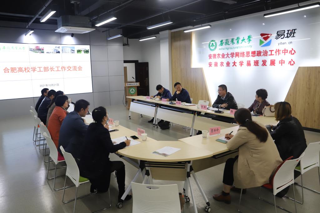 本网讯10月21日下午,我校在易班发展中心组织召开了部分在肥高校学工部(处)处长会议,安徽大学党委学生工作部(处)处长秦楠、安徽建筑大学党委学生工作部(处)处长斯方龙、合肥师范学院党委学生工作部(处)处长陆涛和合肥学院党委学生工作部(处)处长朱涛参加,我校党委学生工作部(处)处长姚莉主持交流会。