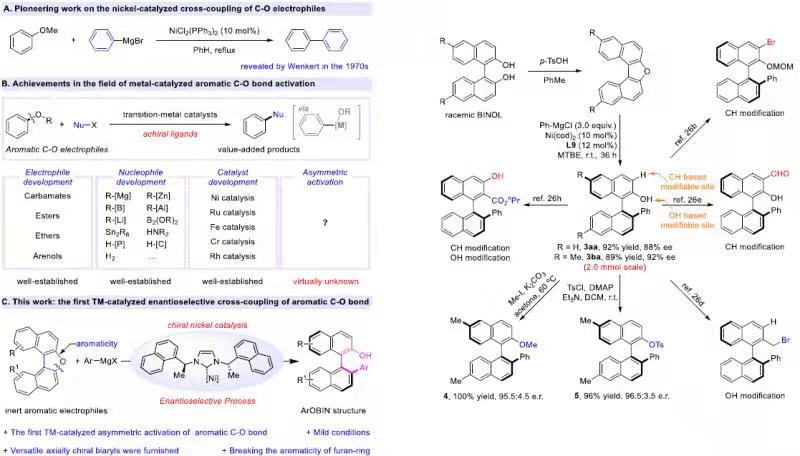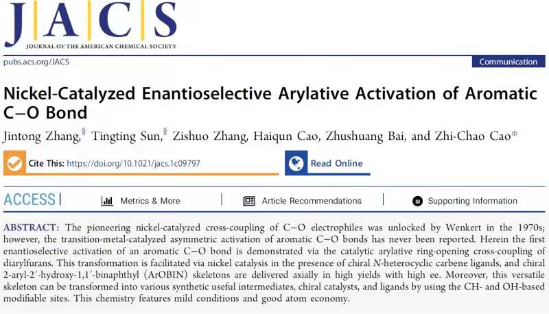 近日,我校植物保护学院绿色农药研发与应用创新团队以廉价易得的含氧化合物为原料,通过发展高效镍/卡宾不对称催化体系,实现了一系列轴手性酚类化合物的快速合成,在国际上首次证明了惰性碳氧键参与不对称转化的可能性。研究结果在线发表在化学及相关领域国际顶级期刊美国化学会志(JACS,IF=15.419)。我校植物保护学院曹志超教授为该论文通讯作者,研究生张金同、孙婷婷为共同第一作者。该研究得到学校引进高层次人才科研启动经费资助。