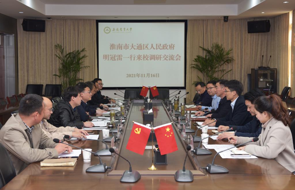 本网讯11月16日下午,淮南市大通区委副书记、区政府代理区长明冠雷一行6人来校,就校区合作事宜进行交流座谈。党委常委、副校长操海群主持座谈会。